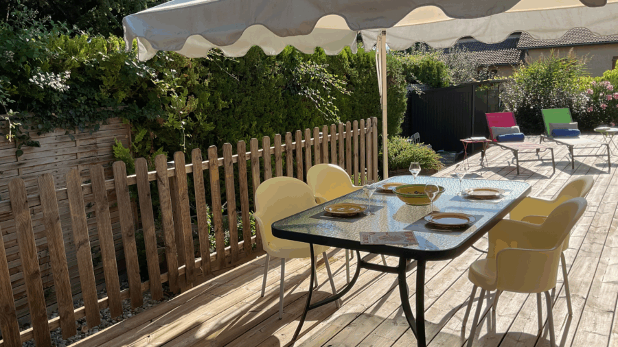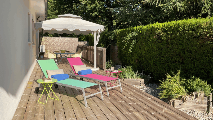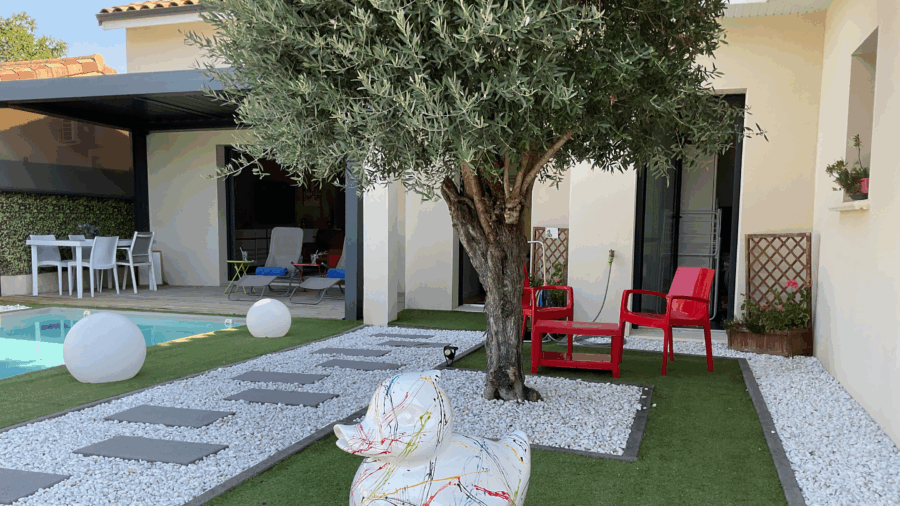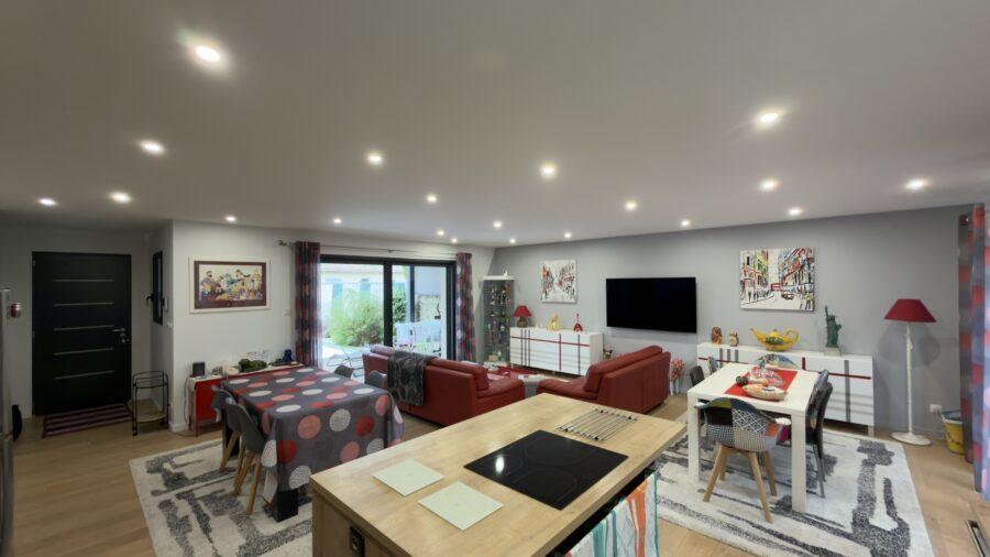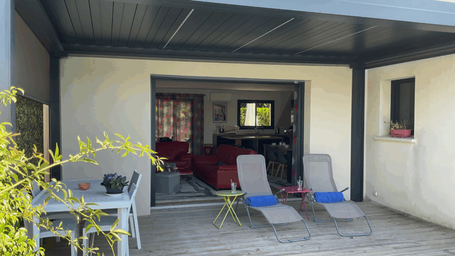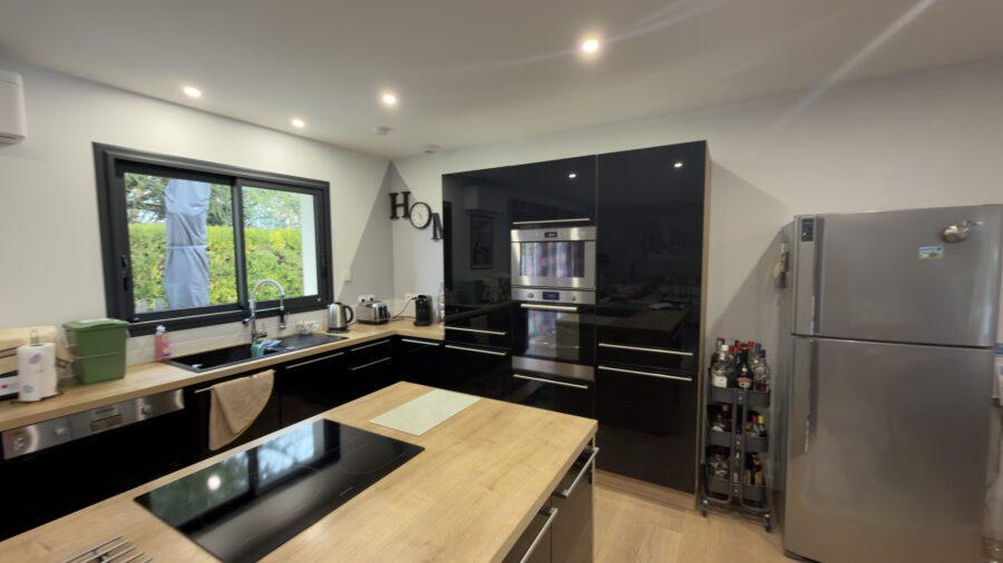 Vous y trouverez une grande pièce de vie de 54 m² avec cuisine ouverte entièrement équipée, donnant sur 2 terrasses bois dont une couverte par une pergola, avec vue sur la piscine au Sud.