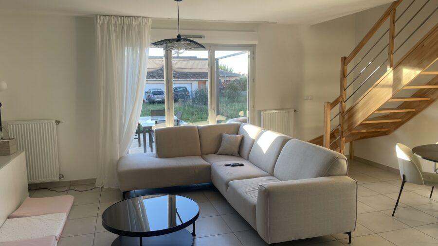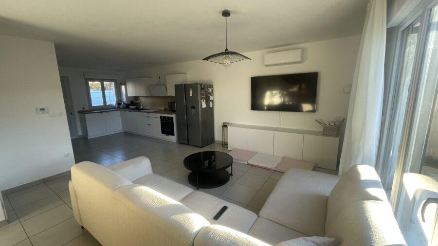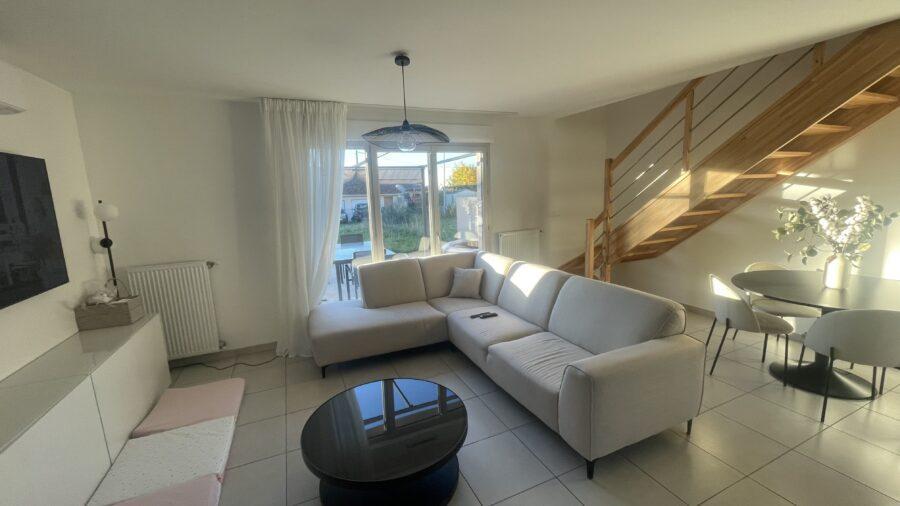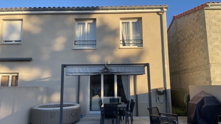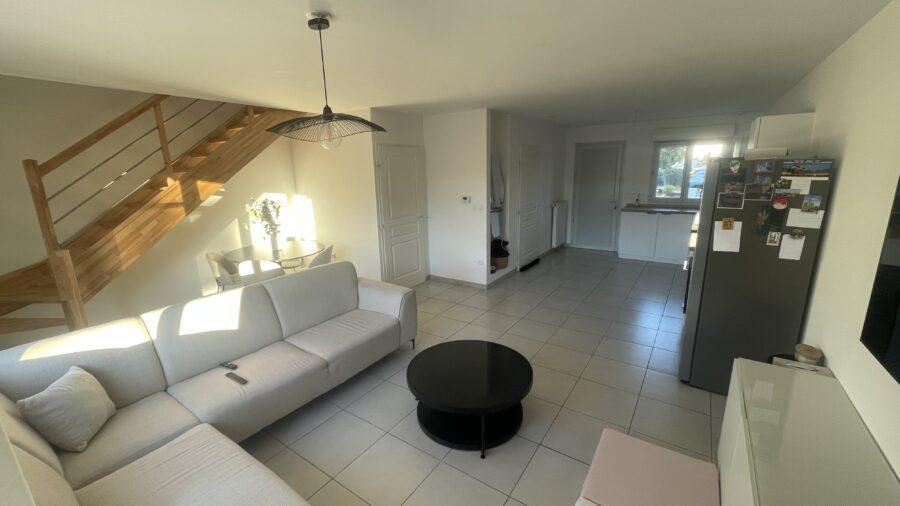 Maison récente de 2022, mitoyenne d’un seul côté, offrant 80 m² habitables sur un terrain clos de 225 m², dans un environnement calme et à proximité immédiate des commodités.
