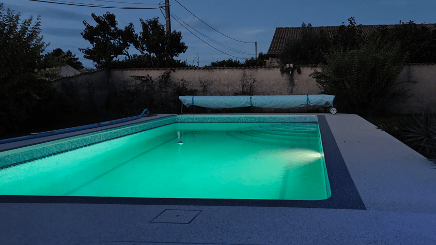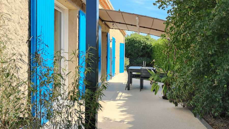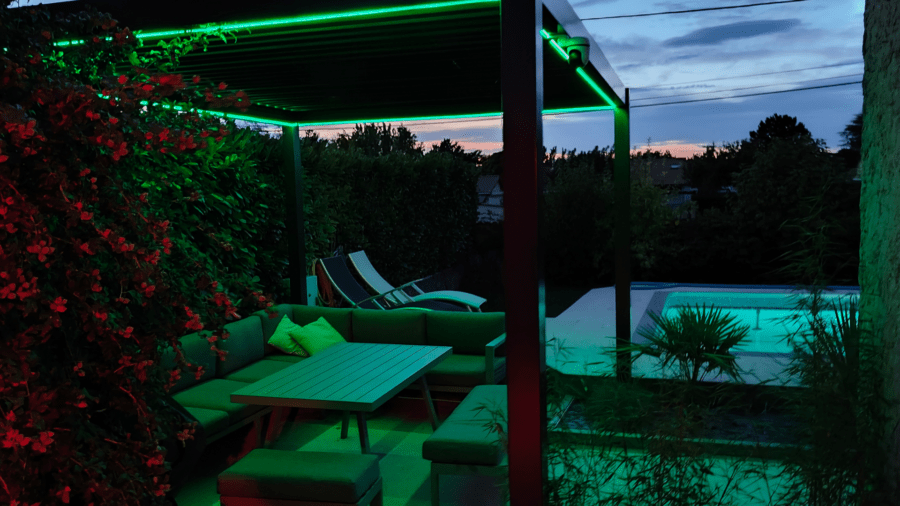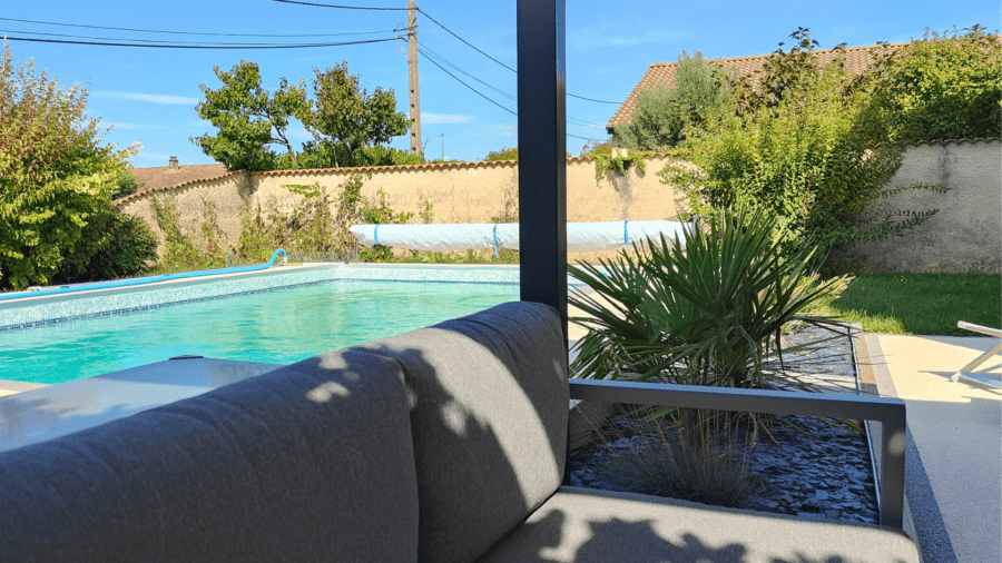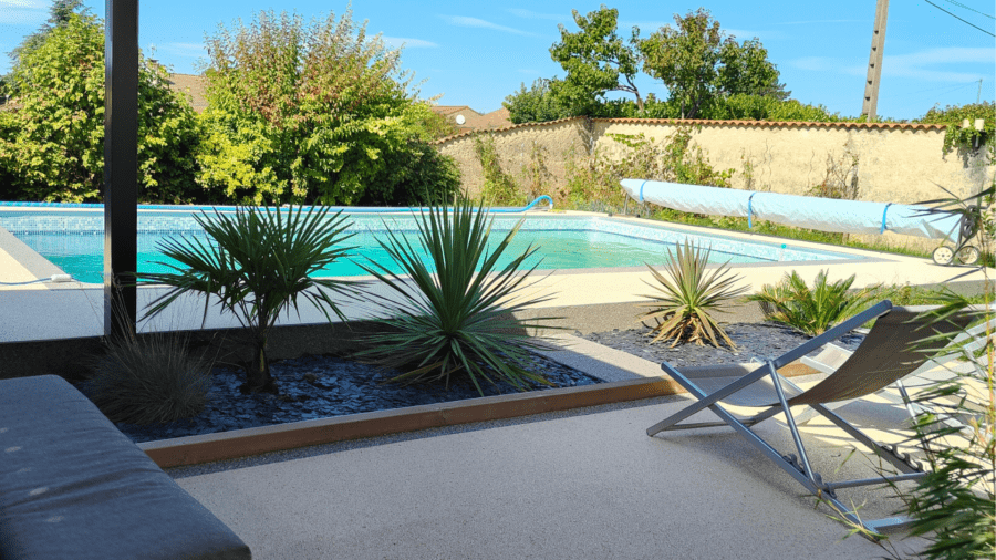 La piscine avec son salon de jardin sous sa pergola et son entourage en granula marbre pour un entretien pratique.