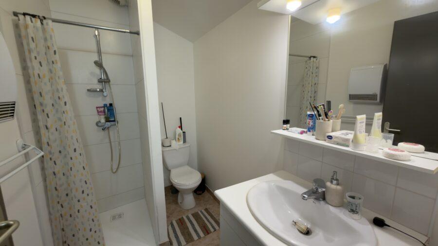 À l’étage, l’espace nuit se compose de 2 chambres et d’une salle d’eau, équipée d’une douche à l’italienne.