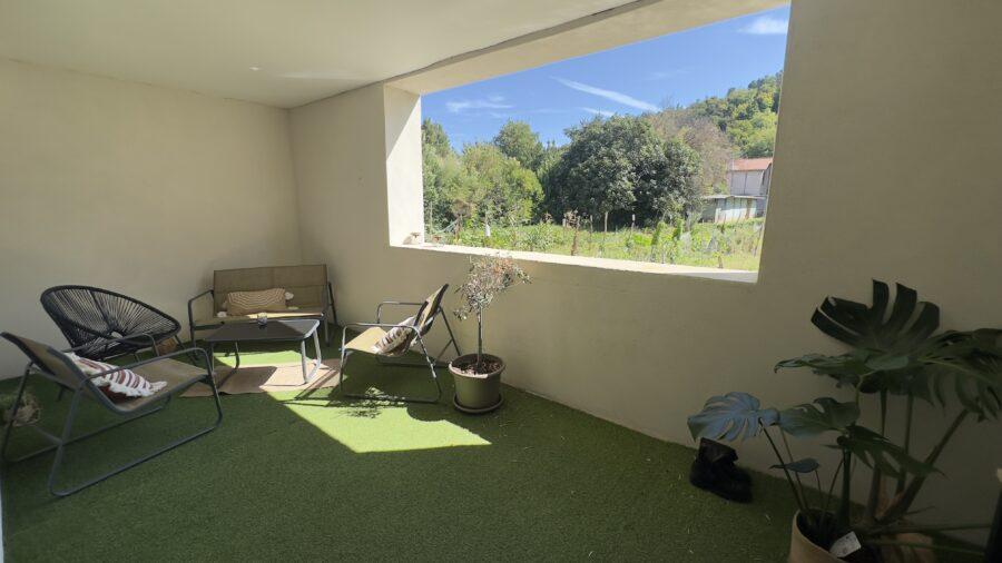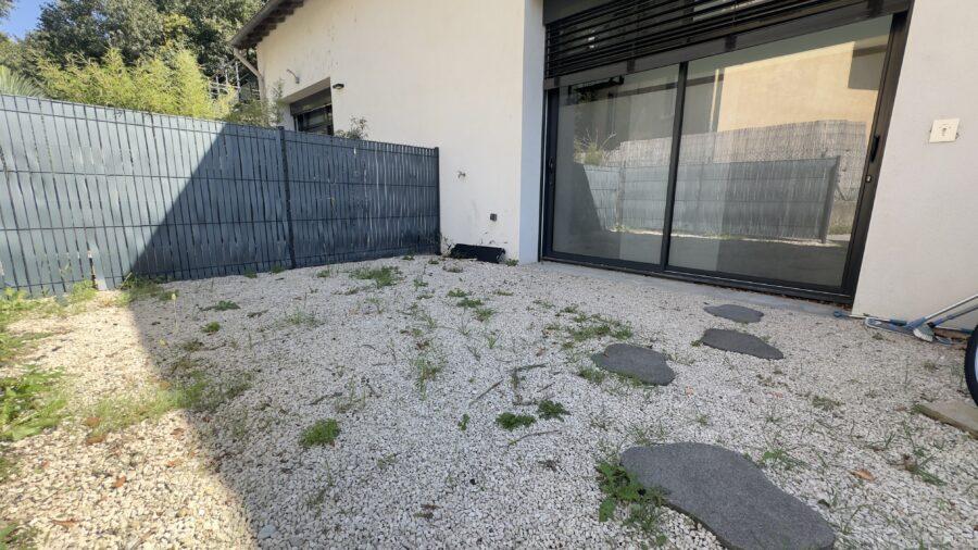 2 extérieurs : une cour à l’avant et une terrasse couverte à l’arrière. Une place de parking privative.